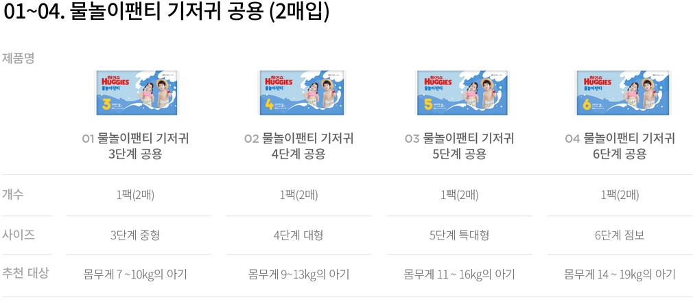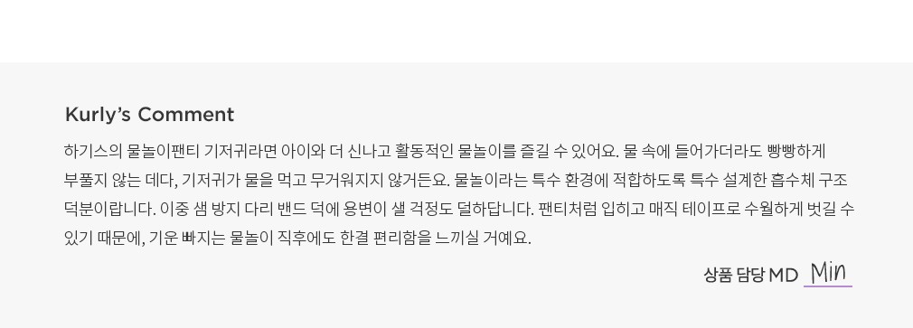 ・일반 팬티 기저귀와는 흡수체 구조가 다르게 설계되어 있습니다. 물 밖 환경에서 일반 팬티 기저귀의 대체용으로는 사용을 권장하지 않아요.
