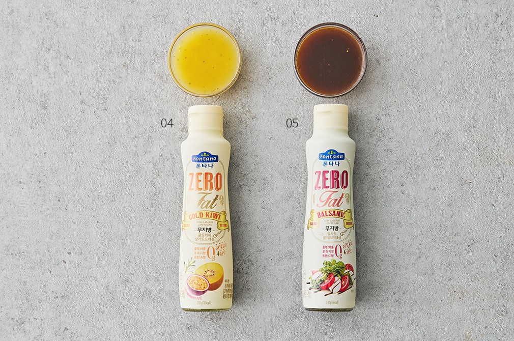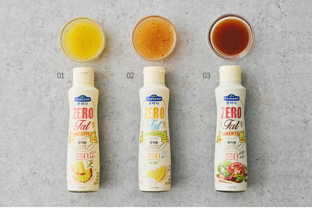 식단 조절을 하시는 분들이라면 샐러드에 뿌리는 새콤달콤한 드레싱마저도 부담스러울 때가 있지요. 폰타나의 무지방 드레싱으로 걱정은 덜고, 샐러드의 맛은 더해보세요. 다양한 샐러드 토핑과 잘 어우러지도록, 재료 본연의 맛을 살려 만들었답니다. 누구나 좋아하는 오리엔탈 드레싱부터 과일 퓨레를 넣은 상큼한 드레싱까지 다섯 종류를 준비했으니, 취향에 맞게 골라 다채롭게 활용해보세요.