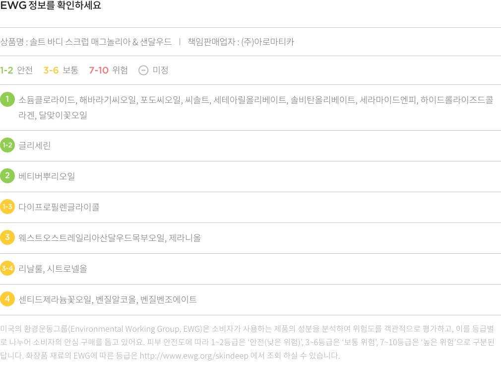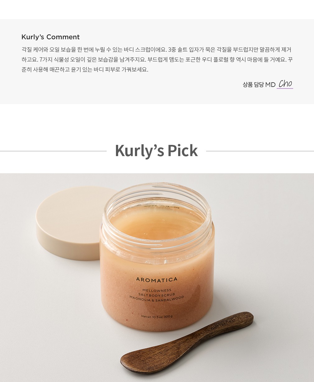 ・ 특징 : 3중 솔트 입자와 7가지 식물성 오일을 담았어요. 매끈하고 촉촉한 바디 피부로 가꿔줍니다.