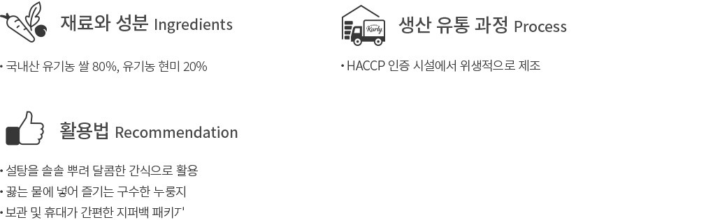 활용팁 ・누룽지를 기름에 살짝 튀긴 후 설탕을 솔솔 뿌려 드셔 보세요. 바삭하고 달콤한 간식으로 그만이에요.