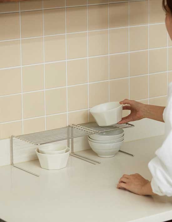 디귿자 형태의 심플한 거치대! 2가지 사이즈로 상부장의 구조에 따라 사이즈를 선택하여 사용할 수 있는 접시정리대