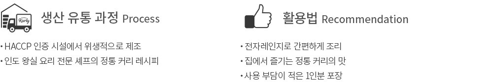 ・특징 : 한국식 ‘카레’와 가장 유사한 오리지널 옐로 커리인데요. 강황의 고급스러운 풍미에 다채로운 향신료의 맛과 향을 더해 커리 본연의 맛이 잘 살아 있답니다.