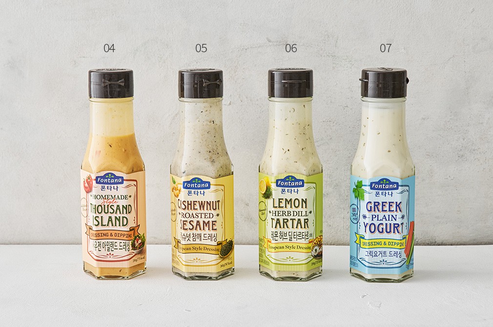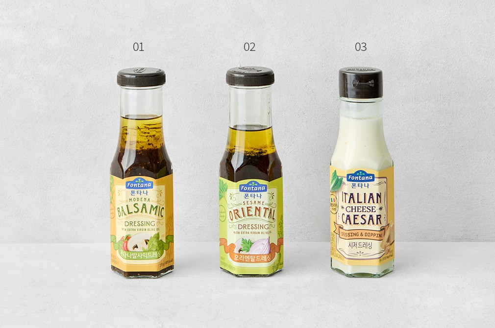 샐러드에 어떤 드레싱을 뿌리느냐에 따라 그 맛마저 바뀌는 것 같을 때, 드레싱의 위력을 실감하곤 하죠. 지금 소개하는 폰타나 드레싱으로 샐러드에 각양각색의 풍미를 더해보세요. 무난하게 즐길 수 있는 발사믹, 오리엔탈을 비롯해 시저, 사우전 아일랜드까지 다양한 종류를 준비했답니다. 샐러드 드레싱은 물론, 샌드위치나 튀김 요리 등에 곁들이는 소스로도 활용할 수 있어 더욱 만족스럽죠. 취향에 따라 골라 다양하게 즐겨보세요.