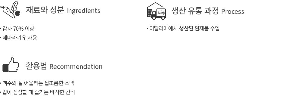 ・특징 : 풍성한 양념으로 진한 스모크 향을 느낄 수 있는 감자칩이에요. 두툼하게 커팅해 크런치하게 부서지는 식감이 일품이에요.