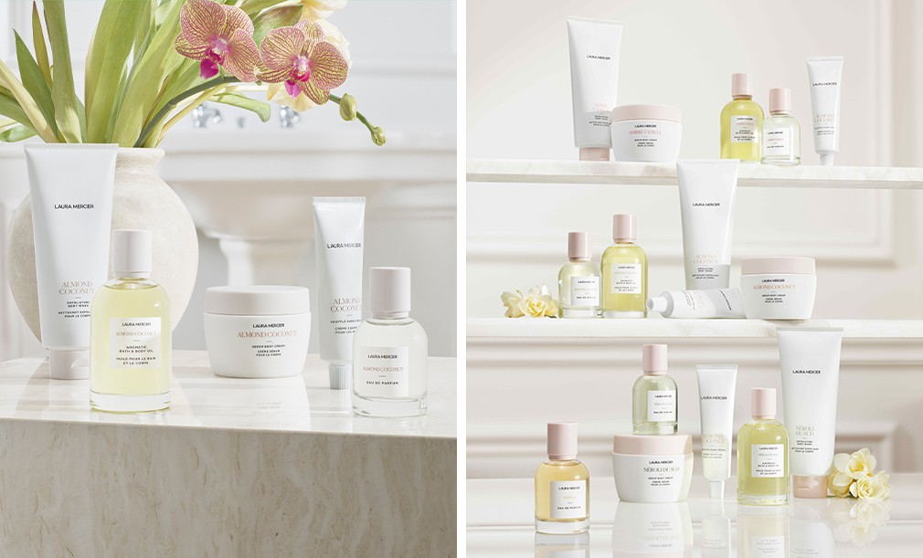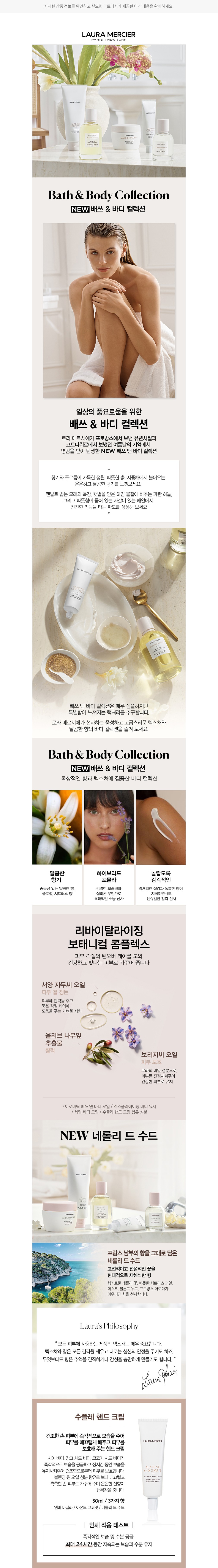 일상에 스미는 향기로움, 배쓰 & 바디 컬렉션 풍성한 감촉과 달콤한 향을 담은 로라 메르시에의 배쓰 & 바디 컬렉션을 소개합니다. 창립자 로라 메르시에가 프로방스에서 보낸 유년 시절과 여름날 코트다쥐르에서의 기억으로부터 영감을 받은 컬렉션인데요. 여름에 어울리는 네롤리 드 수드 향을 추가하여 오랜 시간 사랑받아온 바디 라인을 새롭게 선보였지요. 바디 오일과 워시, 크림부터 핸드크림과 오드 퍼퓸까지, 다섯 가지의 제품을 심플하지만 우아한 패키지로 만나볼 수 있답니다. 온몸을 은은하게 감싸는 향기, 로라 메르시에의 특별한 컬렉션으로 경험해 보세요.