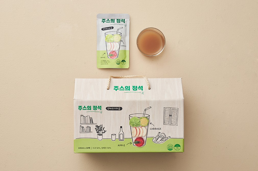 신선한 과채의 영양을 그대로 전하는 브랜드, 주스의 정석이 선보이는 양배추 사과즙을 소개할게요. 다른 것은 일절 섞지 않고 오직 국내산 양배추와 사과만을 담았어요. 물 한 방울 넣지 않고 과채만 통째로 착즙해 만들었기에 진한 맛과 향을 자랑하지요. 사과와 양배추를 50%씩 배합했으니 더욱 맛있게 즐길 수 있답니다. 깔끔한 손잡이 박스에 포장했으니, 마음을 전하는 선물로도 제격일 거예요.