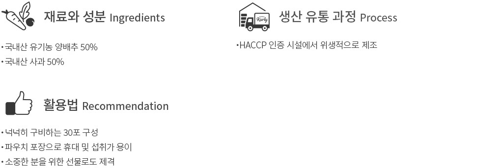 ・ 특징 : 국내산 양배추와 사과를 착즙해 만들었어요. 다른 것은 일절 넣지 않고 오직 과채로만 만들었습니다.