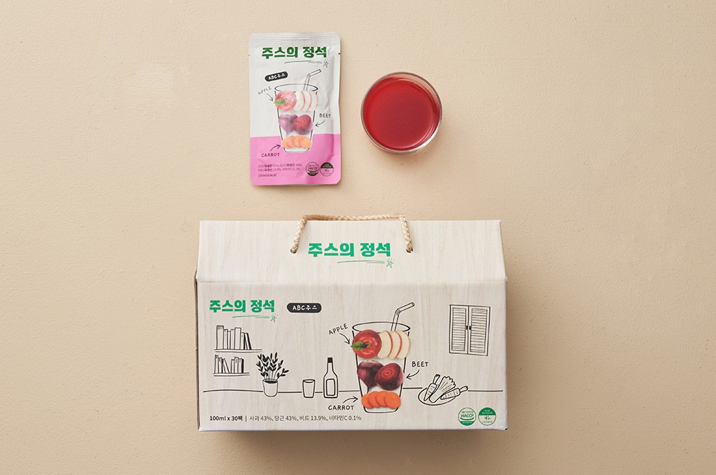 신선한 과채의 영양을 그대로 전하는 브랜드, 주스의 정석이 선보이는 ABC 주스를 소개할게요. 다른 것은 일절 섞지 않고 오직 국내산 사과와 당근, 비트, 그리고 비타민 C만을 담았어요. 물 한 방울 넣지 않고 과채만 통째로 착즙해 만들었기에 진한 맛과 향을 자랑하지요. 사과와 당근을 각각 43%씩, 비트를 13.9%로 배합했으니 누구나 맛있게 즐길 수 있답니다. 깔끔한 손잡이 박스에 포장했으니, 마음을 전하는 선물로도 제격일 거예요.