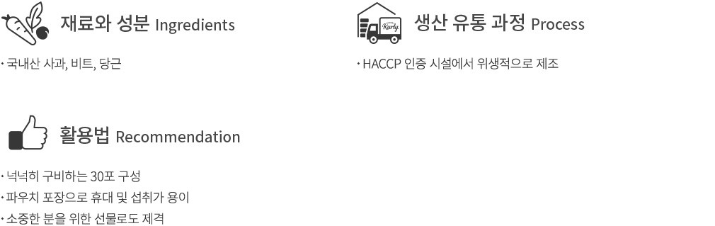 ・특징 : 국내산 사과와 비트, 당근을 착즙해 만들었어요. 과채와 비타민C 외에는 물 한 방울 넣지 않고 오직 과채로만 만들었습니다.