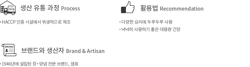 샘표 간장은 70여 년간 변치 않고 대한민국 주부들의 사랑을 듬뿍 받는 간장이에요. 지금 만나 볼 진간장 금S는 깊은 풍미와 진한 감칠맛이 매력적인 간장입니다. 열을 가해도 맛과 향이 잘 변하지 않기 때문에 조림, 볶음 요리에 사용하기 좋지요. 일부러 마트에 가지 않고도 집에서 편하게 받아 볼 수 있도록 준비했으니, 장바구니에 쏙 담아 보세요.
