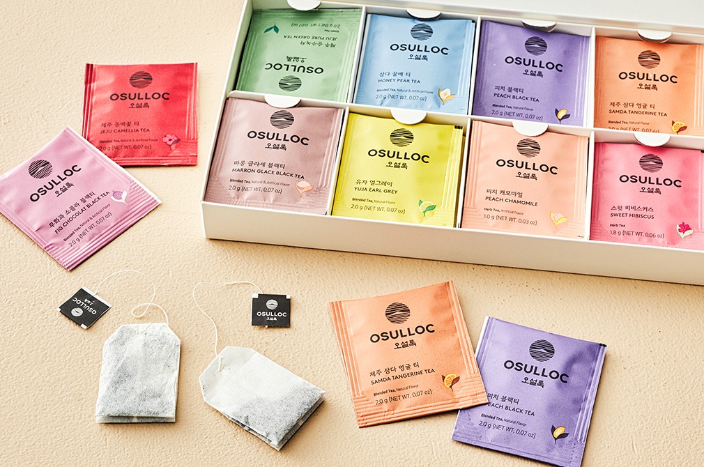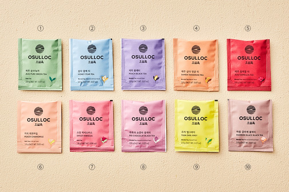 오설록 프리미엄 티 컬렉션 10종 ・ 구성 : ①제주 순수녹차, ②삼다 꿀배 티, ③피치 블랙티, ④제주 삼다 영귤 티, ⑤제주 동백꽃 티, ⑥피치 캐모마일, ⑦스윗 히비스커스, ⑧무화과 쇼콜라 블랙티, ⑨유자 얼그레이, ⑩마롱 글라세 블랙티