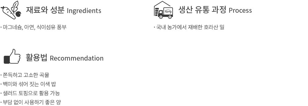 이렇게 활용하세요 ・반나절 이상 충분히 불린 호라산 밀을 삶아 샐러드 토핑으로 올려보세요. 호라산 밀의 톡톡 터지는 식감과 고소한 맛이 잎채소와 조화롭게 어우러진답니다.