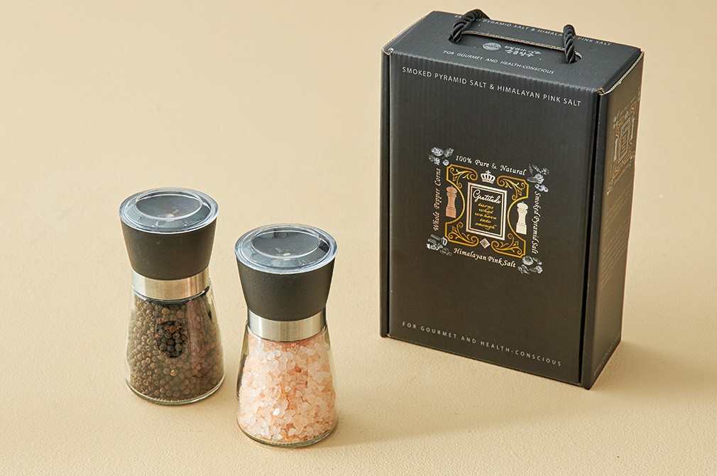 선물세트 프리미엄 1호 ・ 구성 : ①굵은 히말라야 핑크소금 그라인더, ②블랙 통후추 그라인더