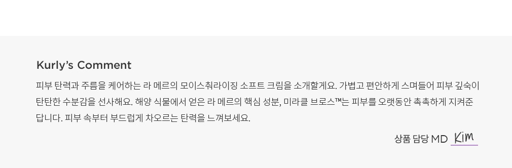 라 메르는 바다의 경이로움에서 영감을 받아 탄생한 프레스티지 뷰티 브랜드입니다. 창립자는 그중에서도 강인한 생명력과 뛰어난 자생력을 지닌 자이언트 켈프에 많은 관심을 가지고 있었습니다. 수많은 시행착오와 끈질긴 연구를 통해 기적 같은 힘을 지닌 미라클 브로스™를 발견하죠. 하지만, 미라클 브로스™를 만나기 위해서는 기나긴 인고의 시간을 견뎌야 합니다. 켈프를 정성스레 채취한 후, 정확하고 섬세한 발효 과정을 거쳐야 하기 때문이죠. 현재까지도 라 메르는 이 방식을 엄격하게 고수하며 제품을 제조하고 있어요. 그렇기에 라 메르 스킨케어는 오랜 기다림과 정교한 장인 정신의 결과물이라 할 수 있습니다. 라 메르가 전하는 강력한 에너지를 경험해보세요.