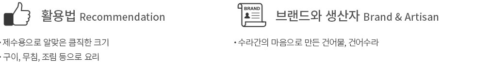 건어수라는 왕의 식사를 책임지던 수라간의 마음으로, 깨끗하고 믿음직한 건어물을 선보입니다. 이번에는 큼지막한 크기를 자랑하는 제수용 황태포를 준비했어요. 품질 좋은 명태를 깨끗하게 손질하고 정성스레 건조했지요. 찬 바람에 얼고 녹기를 반복하며 선명한 노란빛이 물들고 고소한 맛은 한층 깊어졌답니다. 제사가 끝난 후엔 구이, 무침, 조림 등 온 가족을 위한 요리로도 활용해 보세요.