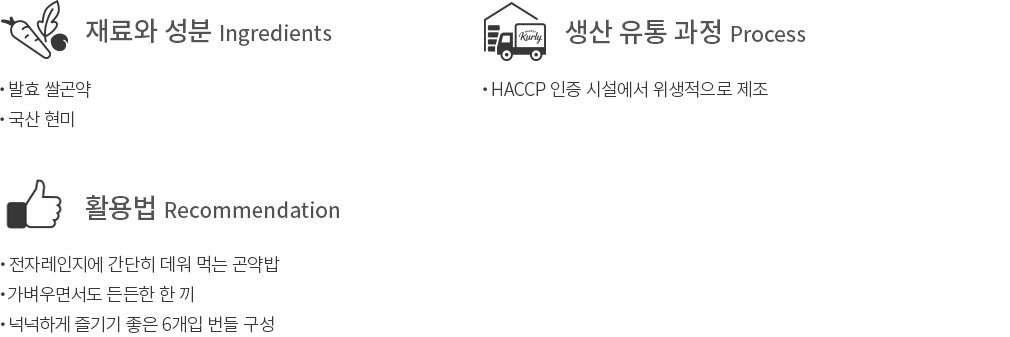 ・특징 : 발효 곤약 쌀과 귀리, 국산 현미 등을 사용해, 쫄깃한 식감으로 즐길 수 있어요.