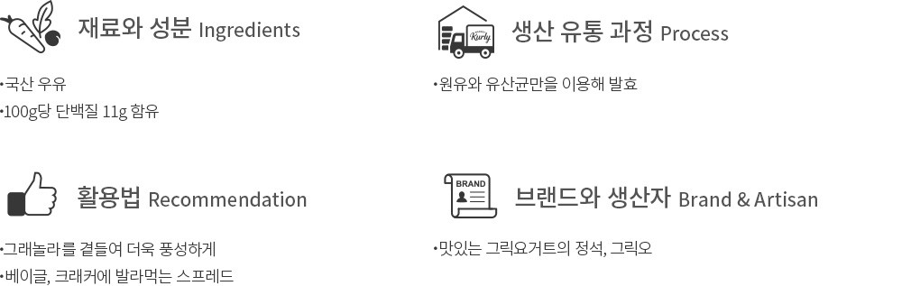 모두가 안심하고 맛있게 즐길 수 있는 그릭요거트를 선보이는 브랜드, 그릭오를 소개합니다. 지금 만나볼 띠크 그릭요거트는 신선한 국산 우유와 유산균만으로 깔끔하고 꾸덕하게 완성한 제품이에요. 그릭오만의 유산균 배합으로 산미는 줄이고 고소한 풍미를 제대로 살려 만들었답니다. 100g당 단백질이 11g 함유되어 있어 더욱 든든하지요. 꿀이나 그래놀라를 곁들여 풍성하게 즐겨보세요. 빵, 크래커에 바르는 스프레드로도 좋을 거예요.