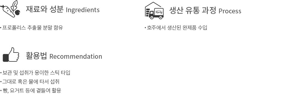 네이처스탑은 30여 년간 축적된 연구실적을 바탕으로, 신선한 자연 원료를 사용해 생산하는 브랜드예요. 지금 소개할 제품은 마누카 꿀 본연의 묵직하고 진한 달콤함을 잘 살려 완성한 스틱입니다. 프로폴리스 추출물 분말을 함유해 든든한 것은 물론이고요. 키위향을 더해 한층 산뜻하게 즐길 수 있답니다. 한 번에 먹기 좋은 양을 스틱 형태로 완성했기에 간편하게 섭취할 수 있어요. 그대로 드시는 것은 물론, 빵이나 요거트에 곁들여 즐기기에도 좋을 거예요.