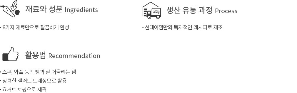 선데이잼은 2012년 회사를 그만둔 후, 강병진 대표가 가꾸던 작은 도심 텃밭에서 시작했어요. 마음과 땀을 쏟아 보살핀 텃밭에서 맺힌 결실들로 잼을 만들었지요. 과일 본연의 풍미를 그대로 살리려는 그의 노력은 선데이잼에 고스란히 녹아 있는데요. 설탕을 거의 사용하지 않고 과일만으로 잼을 만들기 위해, 원재료의 특성과 성분에 대해 기록하고 또 연구했어요. 잼의 형태를 만들기 위해 부족한 성분이 있다면, 다른 과일에서 그 답을 찾았지요. 선데이잼만의 특별한 잼 레시피와 조합은 바로 이렇게 탄생했답니다. 다가오는 일요일에는 영양과 맛의 균형이 제대로 잡힌 선데이잼과 색다른 휴식을 즐겨 보세요. 그동안 맛보지 못했던 새로운 달콤함에 흠뻑 빠지게 될 거예요.