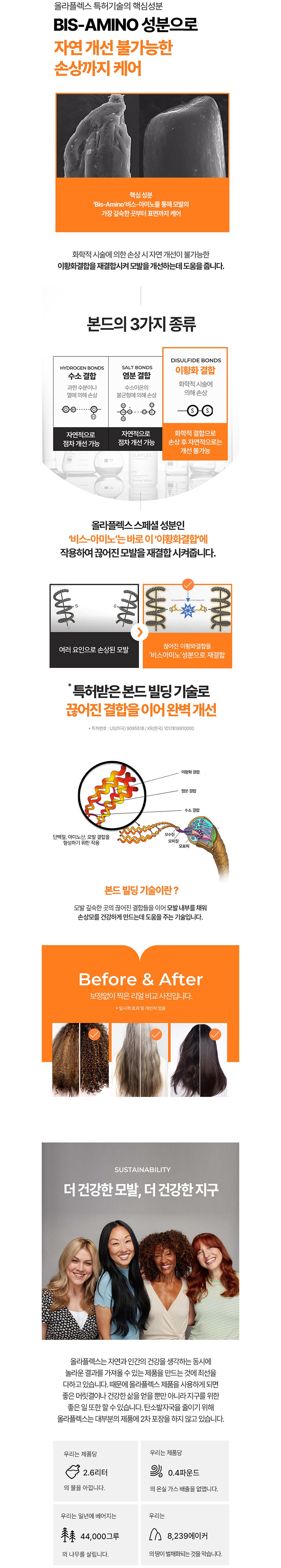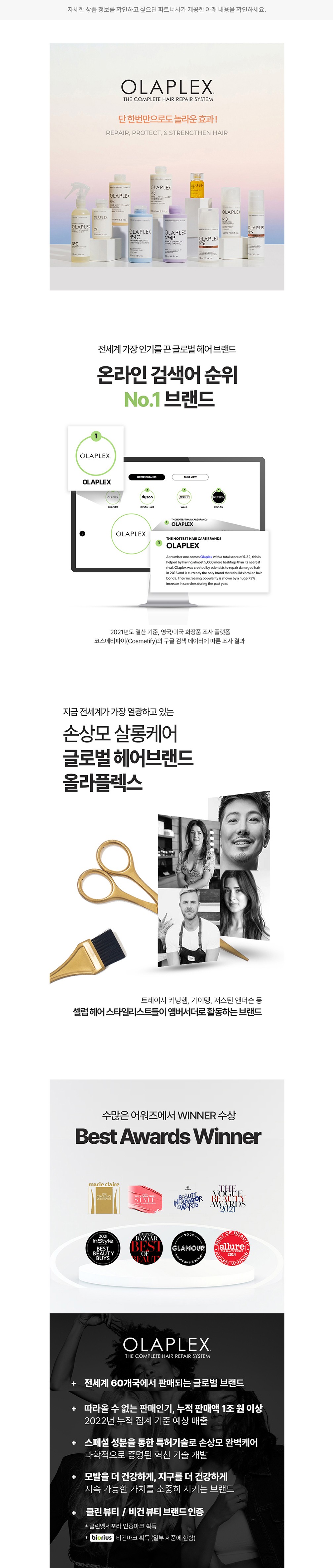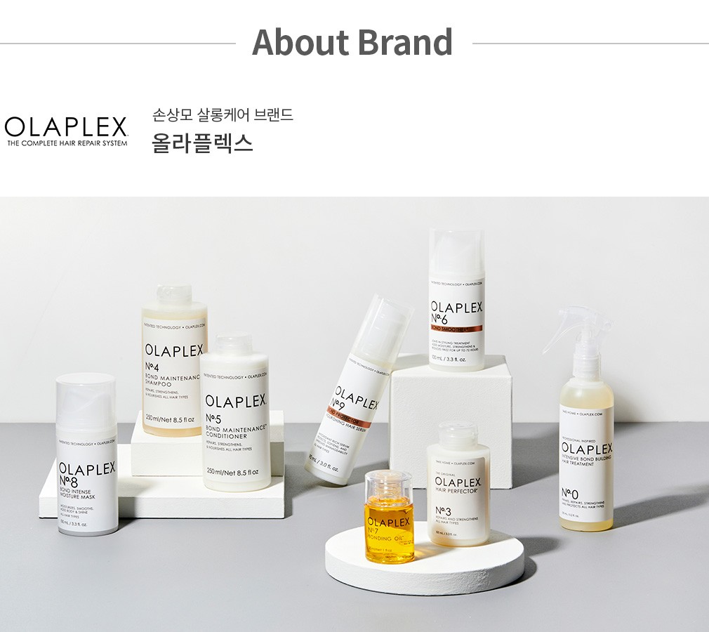 평소 헤어케어에 관심이 있다면 낯설지 않을, 미국의 프리미엄 손상모 케어 브랜드예요. 전문가용 프로페셔널 라인을 시작으로 헤어 살롱 업계에서 대대적인 인기를 끌었는데요. 이후 살롱 못지않은 홈 케어 라인을 론칭하며 전 세계인의 마음을 사로잡았죠. 올라플렉스의 탁월한 제품력 하면 '본드 빌딩' 기술을 빼놓을 수 없어요. 특허 성분인 비스-아미노를 통해 단순히 모발의 표면만이 아닌 깊숙한 곳부터 영양을 채워주고요. 끊어진 모발을 결합시켜 손상모를 위한 근본적인 솔루션을 제공한답니다. 새롭게 태어나는 건강한 머릿결, 올라플렉스를 통해 경험해 보세요.