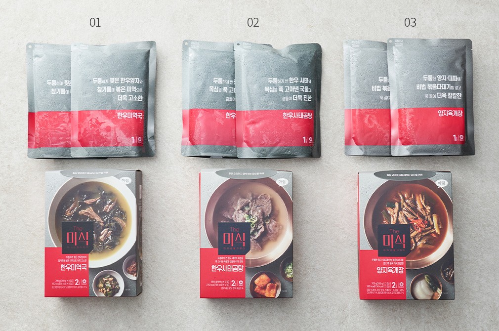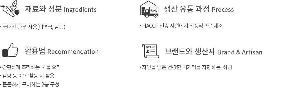 - 미역국 : 우유, 대두, 밀, 토마토, 쇠고기, 조개류(바지락), 이산화황 함유 - 사태곰탕 : 대두, 밀, 쇠고기 함유 - 육개장 : 쇠고기, 대두, 밀, 토마토, 우유, 이산화황 함유 - 알류, 메밀, 땅콩, 고등어, 게, 새우, 돼지고기, 복숭아, 호두, 닭고기, 오징어, 조개류(굴, 전복, 홍합 포함), 잣을 사용한 제품과 같은 제조시설에서 제조.