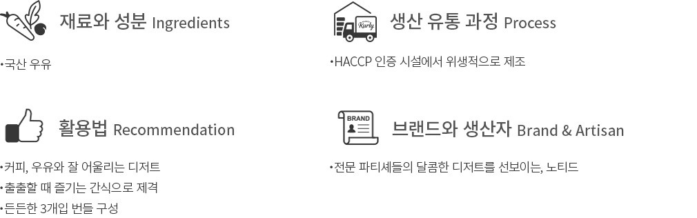 -계란, 우유, 밀, 대두 함유 -이 제품은 메밀, 땅콩, 잣, 호두, 게, 새우, 오징어, 고등어, 조개류(굴, 전복, 홍합 포함), 복숭아, 토마토, 닭고기, 돼지고기, 소고기를 사용한 제품과 같은 제조시설에서 제조