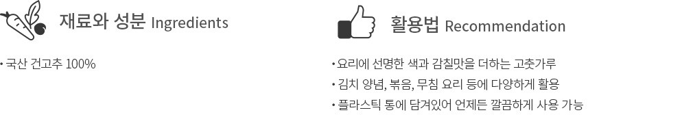 고춧가루는 한식 요리를 할 때 없어선 안 될 핵심 재료 중 하나인데요. 지금 소개하는 한생의 하늘정성 내리찬 태양초 고춧가루는 신선한 국산 건고추를 곱게 갈아 만든 제품이에요. 입자가 굵은 편이기 때문에 김치, 볶음, 무침 요리 등을 할 때 양념용 고춧가루로 활용하기 꼭 알맞답니다. 입구가 2개로 나뉘어 있어 고춧가루를 뿌리는 양을 조절하기도 참 간편하죠. 다양한 요리에 매콤한 감칠맛을 더하고 싶을 때 선택해 보세요.