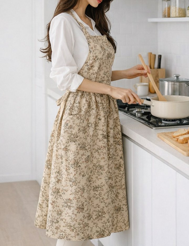 부드러운 순면 원단에 생활방수 기능을 더한 롱 기장 앞치마, 옆 트임 디자인으로 활동성을 높여 주방 홈카페 베이킹까지 편안하게 착용 가능한 데일리 홈웨어 아이템