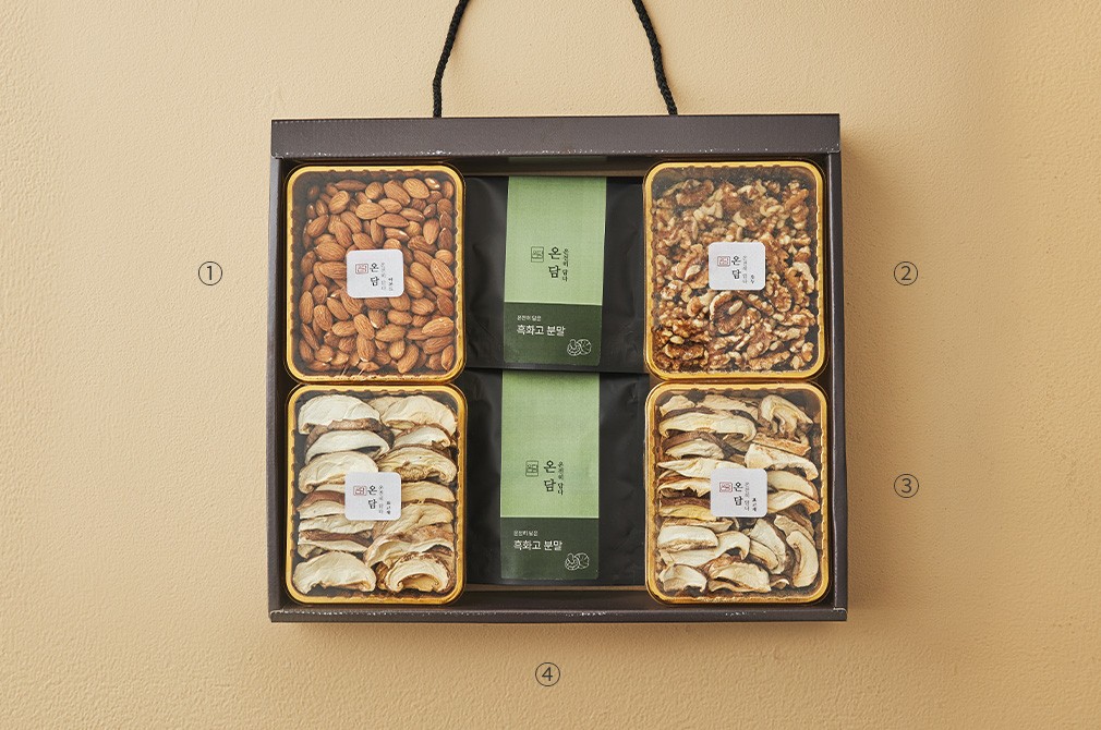 온담 정성담은 견과표고 혼합세트 ・ 구성 : ①아몬드, ②호두, ③표고채, ④흑화고 분말