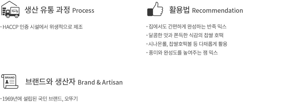 오뚜기의 반죽 믹스로 손쉽게 찹쌀호떡을 만들어보세요. 물만 있으면 집에서도 간단하게 길거리 별미를 즐길 수 있답니다. 발효 시간이 없는 데다 손에 덜 달라붙기 때문에 더욱 빠르고 간편하죠. 국산 찹쌀 가루를 사용해 한층 쫀득한 믹스 반죽에 달콤한 잼 믹스를 양껏 넣어주면 된답니다. 시나몬 롤 등의 다양한 디저트로 응용해보셔도 좋아요.