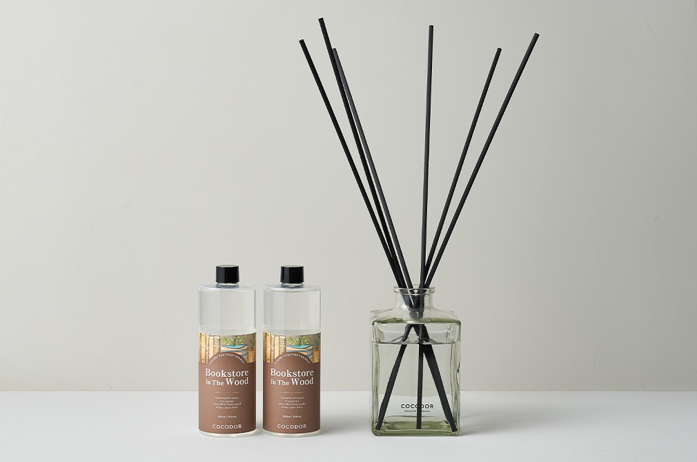 02. 오브제 디퓨저 북스토어인더우드 ・ 구성 : ①디퓨저 본품 2개(500mLX2병), ②오브제 디퓨저 바틀 1개, ③섬유 스틱 48cm 6개