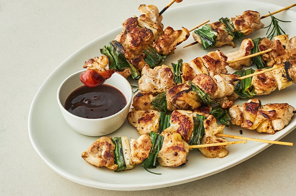 ・ 특징 : 큼직하게 썬 닭다리살 사이 대파를 끼워낸 닭꼬치입니다. 하코야만의 특제 숯불 바베큐 소스를 함께 담아드려요.