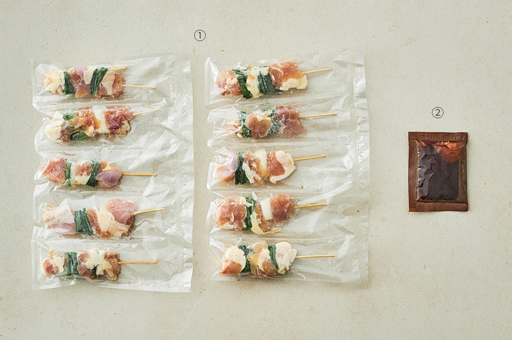 롱 파닭꼬치 ・ 구성 : ①파닭꼬치(50g X 10개입), ②숯불 바베큐 소스(50g X 1봉입)