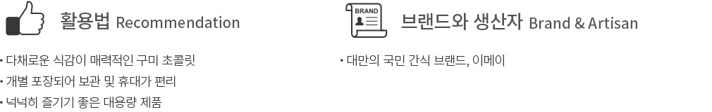 대만의 국민 간식 브랜드, 이메이의 구미 초코볼 2종을 만나 보세요. 달콤한 초콜릿 속에 젤리가 들어있어 상큼한 향과 쫀득한 식감이 아주 매력적인 간식이랍니다. 한 개씩 포장되어 있으니 입이 심심할 때, 혹은 달달한 초콜릿이 끌릴 때 집어먹기 좋아요. 각각 달콤한 포도 젤리와 상큼한 딸기 젤리를 품고 있으니 취향에 맞게 골라 보세요. 집이나 회사에 두거나 파우치에 조금씩 넣어 다녀도 좋을 거예요.