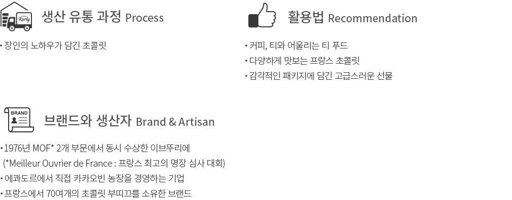 ・특징 : 부드러운 가나슈가 풍부하게 느껴지는 초콜릿이에요. 단단한 외형과는 사뭇 다른 반전 매력이 특징이지요.