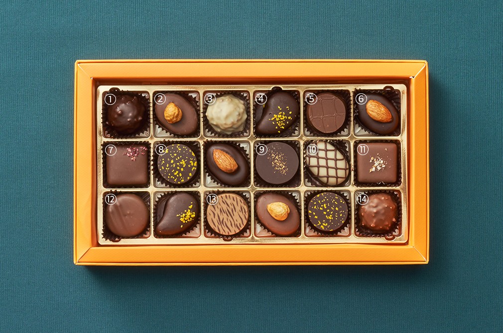 ・구성 : ①로쉐 스트라스부르 다크, ②프랄린 헤이즐넛, ③로쉐 스트라스부르 화이트, ④페어 가나쉬 다크초콜릿, ⑤파레 프랄린 카푸치노 닙, ⑥프랄린 아몬드, ⑦팜므무스 레이트, ⑧파레 다크 비터 가나쉬, ⑨파레 골드 비터 가나쉬 마다가스카, ⑩노이제타, ⑪파리 브레스트, ⑫쟈스민 티 청하오 가나쉬 밀크 초콜릿, ⑬파레 브론드, ⑭로쉐 스트라스부르 밀크