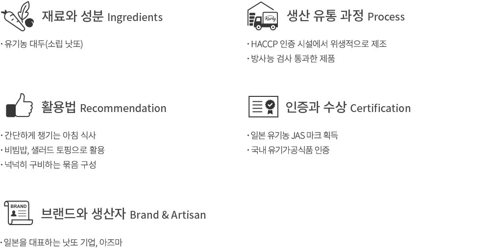 ・특징 : 알갱이가 작은 소립 대두로 만들어 한결 부담 없이 먹기 좋아요. 낫또는 무염이나 간장과 겨자는 무염이 아니니 참고해 주세요.