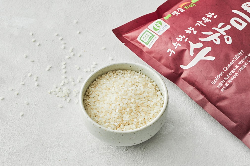 수향미라는 이름은 조금 낯설어도, 골든퀸은 누구나 한번쯤 들어봤을 거예요. 수향미는 바로 이 골든퀸 품종의 또다른 갈래예요. 향이 나는 히말라야 야생 벼와 국내 벼 품종을 교배해 만든 골든퀸 3호 품종으로, 그 이름만큼 우수한 향미를 지니고 있죠. 이 쌀로 밥을 지으면 구수한 누룽지 향이 솔솔 난다고 하는데요. 아밀로스 함량이 낮아 찰기가 뛰어나다는 점도 특징이랍니다. 덕분에 식은 밥에서도 반지르르하게 윤기가 돌고 쫀득한 식감을 오래 유지해요. 1인 가구도 부담스럽지 않은 양을 보내드리니, 필요한 만큼 구매해 신선하게 즐겨보세요.