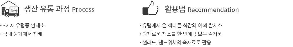 ・ 특징 : 채소 특유의 쌉싸래한 맛이 덜하고 잎이 부드러운 유럽형 쌈채소 3가지를 한 팩에 담았어요.
