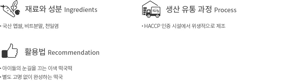 유의사항 ・비트는 원물 특성 상 물듦현상이 강한 편으로, 일반 떡국떡과 함께 조리 시 물들 수 있으니 구입 전 참고해 주세요.