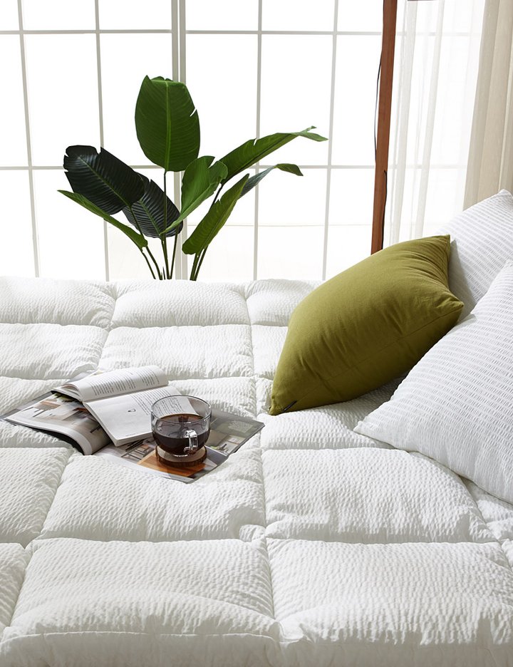 고밀도 시어서커 원단으로 통풍성이 좋고 에어론 가공솜으로 푹신한 가벼운 토퍼