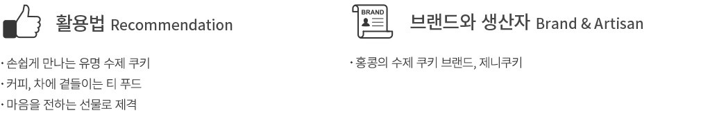 2005년, 홍콩에서 문을 연 제니쿠키는 진한 버터 풍미와 부드러운 식감으로 많은 사랑을 받아온 수제 쿠키 브랜드예요. 홍콩 여행에서 꼭 사 와야 할 기념품이기도 하죠. 섬세한 일러스트가 그려진 틴 케이스 역시 제니쿠키만의 매력인데요. 주기적으로 일러스트가 변경되니 소장 가치까지 있답니다. 이번에는 사르르 녹는 식감이 매력적인 버터 쿠키만을 알차게 담아 준비했어요. 커피, 차와 함께 즐기는 것은 물론, 소중한 분들께 마음을 전하는 선물로도 좋을 거예요.