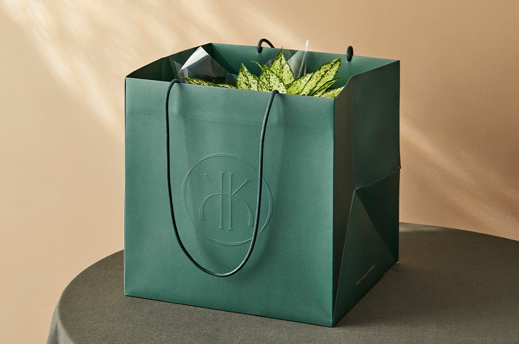 격물공부는 조선호텔의 품격을 고스란히 녹여낸 플라워 부티크 브랜드입니다. 최상의 꽃과 감각적인 디자인을 바탕으로 예술 작품 같은 상품을 선보이죠. 아글라오네마는 하얀 바탕에 화려한 무늬를 띠고 있어 인테리어 포인트로 빛을 발하는 식물인데요. 차분한 색감과 보송한 질감의 화분에 심어 편안하면서도 고급스러운 멋을 드러내죠. 필요에 따라 마음을 표현하는 메시지 카드도 함께 전할 수 있답니다. 고급스러운 전용 쇼핑백에 담아 보내 드리니, 소중한 분을 위한 선물로도 제격일 거예요.