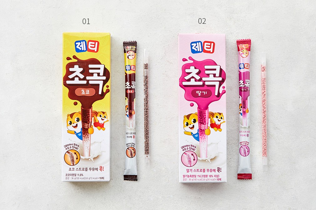 우리 주변에는 잠깐의 여유와 달콤함을 안겨주는 다양한 음료들이 있죠. 이번에는 우유에 콕 꽂아 간편하게 마실 수 있는 제티 초콕을 소개할게요. 주름진 빨대 타입의 제품이라 구부려서 편하게 달콤한 우유를 즐길 수 있답니다. 오랜 기간 사랑받아온 초콜릿과 새콤달콤한 딸기로 두 가지 맛을 준비했으니, 취향에 따라 골라보세요.