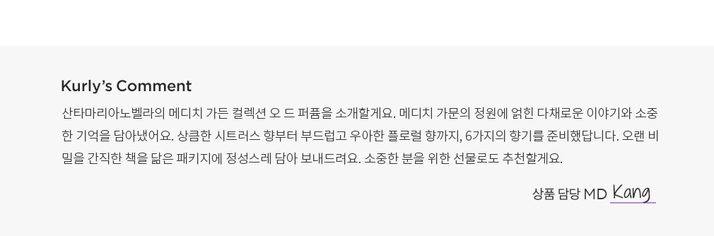 메디치 가든 컬렉션 신비로운 영감으로 가득한 메디치 가문의 정원에서 영감을 받은 산타마리아노벨라의 오 드 퍼퓸을 소개할게요. 피렌체의 문화와 예술이 가장 번영하던 시절, 메디치 가문의 다채로운 이야기와 소중한 기억을 담아냈어요. 오랜 시간 메디치 가문의 정원을 지켜온 매그놀리아부터 비밀 온실에 숨겨왔던 자스민의 향기까지. 1700년대 산타마리아노벨라가 사용했던 귀중품 운반 상자를 오마주한 패키지에 담아내 더욱 특별하답니다. 부드럽게 퍼져오는 향기 뒤에 숨겨진 오랜 이야기를 만나보세요.
