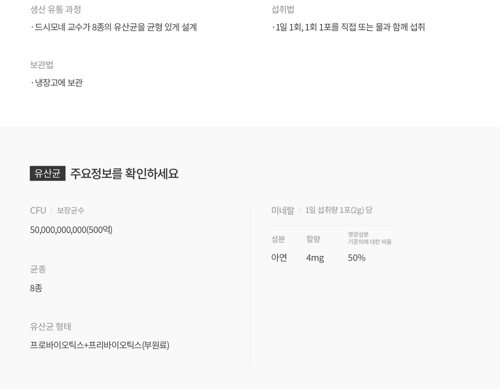 - 우유 함유(유산균 배양시 우유가 함유된 배양 배지가 사용되었습니다.) - 이 제품은 알레르기 발생 가능성이 있는 알류(가금류), 메밀, 땅콩, 대두, 밀, 고등어, 게, 새우, 돼지고기, 복숭아, 토마토, 아황산류, 호두, 닭고기, 쇠고기, 오징어, 조개류(굴, 전복, 홍합 포함), 잣을 사용한 제품과 같은 제조시설에서 제조하고 있습니다.