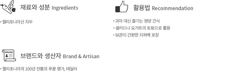 100년 전통의 푸룬 명가, 테일러가 선보이는 건 푸룬을 만나보세요. 당도 높고 큼지막한 자두의 씨를 제거하고 알맞게 말렸어요. 덕분에 특유의 맛과 영양을 그대로 간직하고 있지요. 하나씩 꺼내 쫀득한 식감과 달콤함을 맛보세요. 그대로 하나씩 드셔도 좋고, 샐러나 요거트의 토핑으로 올려도 참 잘 어울릴 거예요.