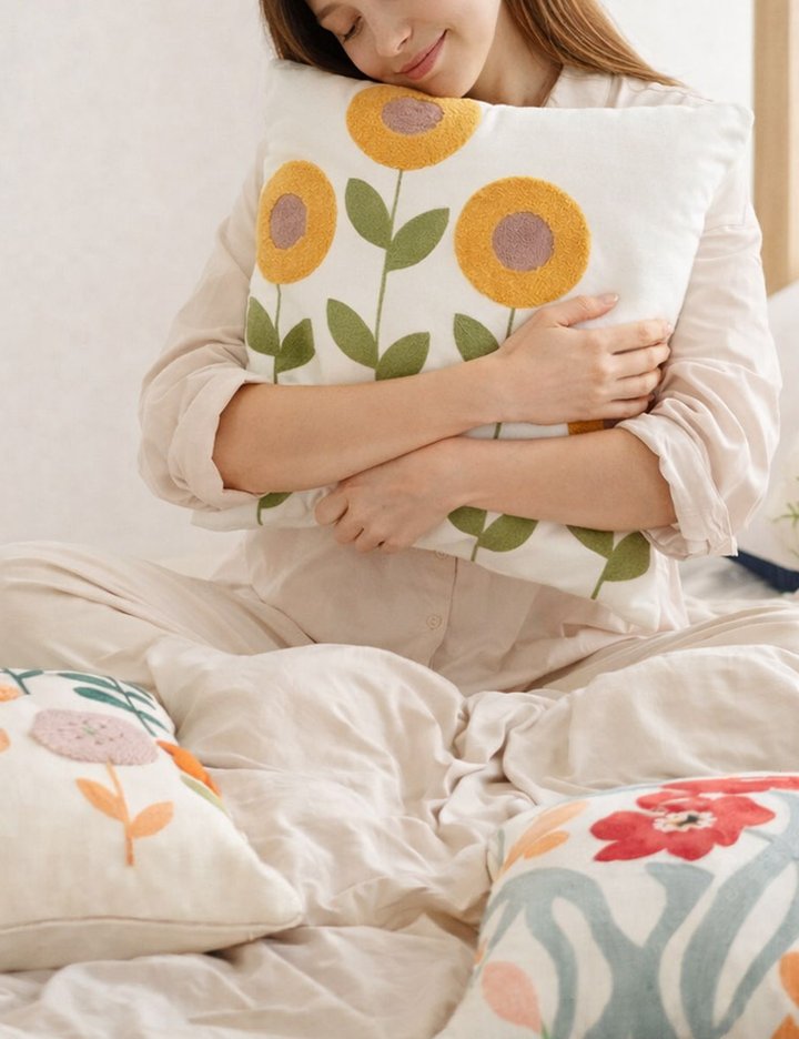 공간에 포인트를 더하는 카멜리아 컬러 쿠션, 러프한 질감과 부드러운 쿠션감으로 소파 위를 감성적으로 완성
