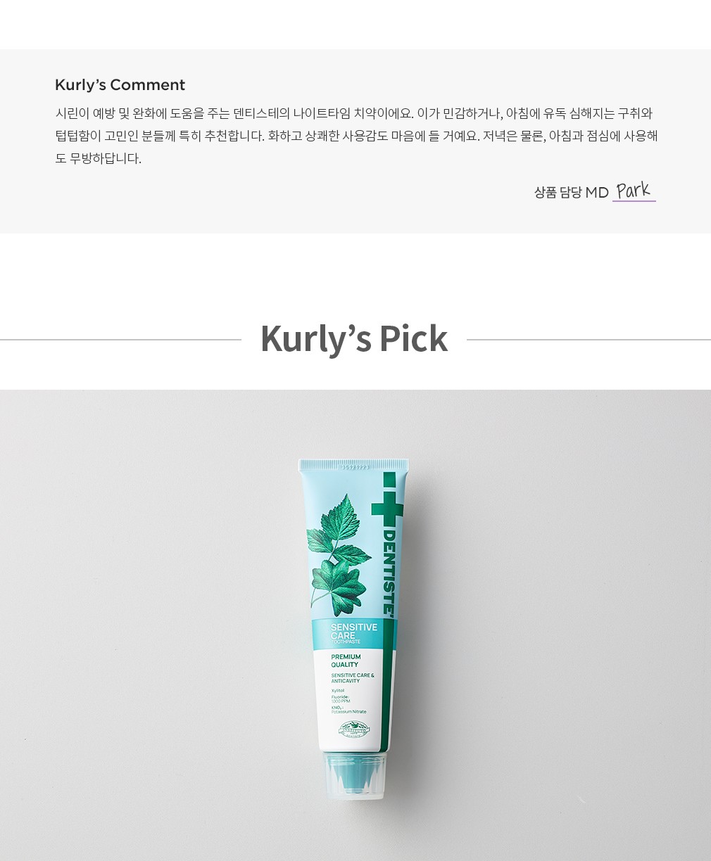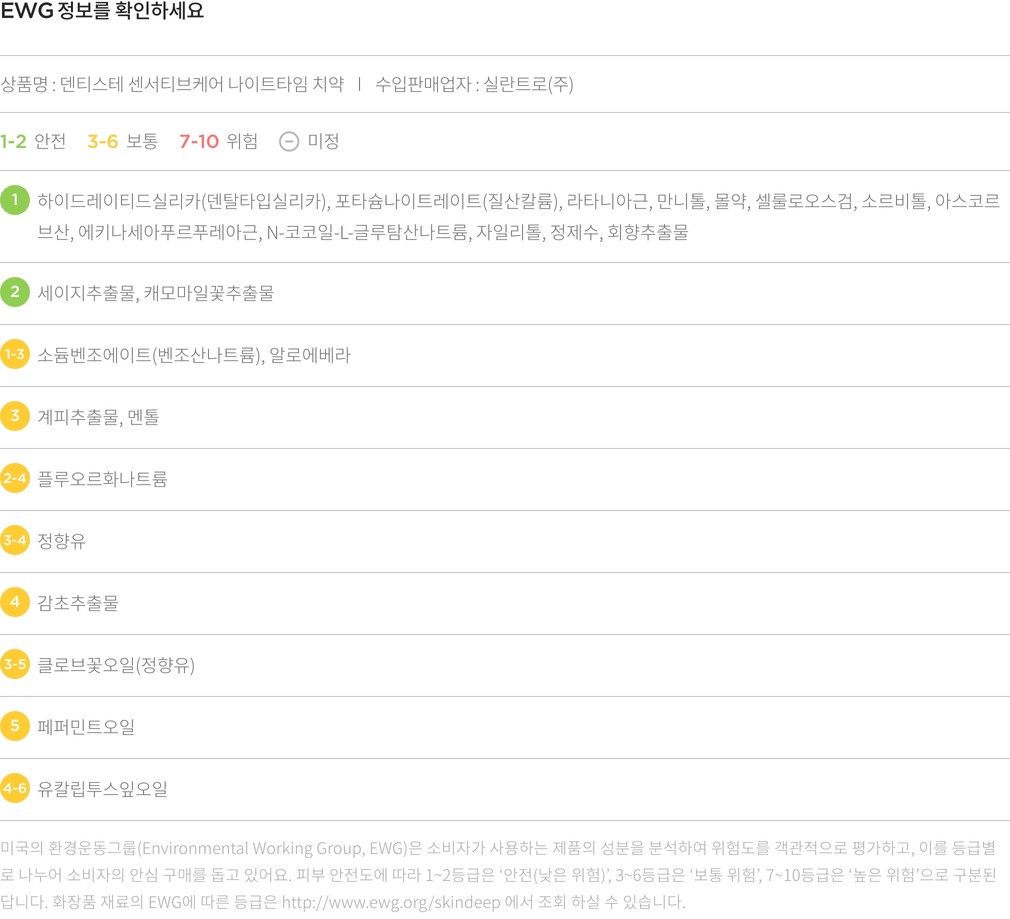 ・ 특징 : 시린이 예방 및 완화에 도움을 주는 치약입니다. 나이트타임 치약이지만 아침, 점심에 사용할 수 있어요.