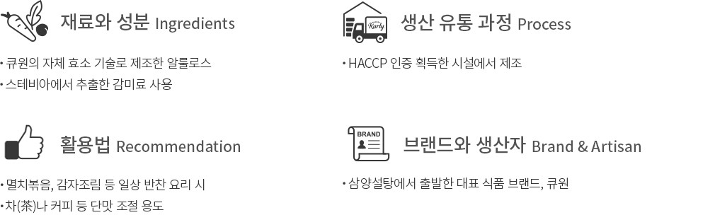 높은 당류는 늘 걱정이지만 달콤한 맛을 포기하기란 쉽지 않죠. 큐원이 프리미엄 당 브랜드로 선보이는 트루스위트 알룰로스로 그 걱정을 조금이나마 덜어보세요. 알룰로스는 무화과, 사탕무, 밀 등 자연에 매우 소량 존재하는 희소당인데요. 큐원은 자체 기술을 이용해 알룰로스를 탄생시켰답니다. 식단 관리 중인 분들도 부담 없이 즐길 수 있을 거예요. 일상 속에서 더욱 가볍게 단 맛을 즐겨보세요.